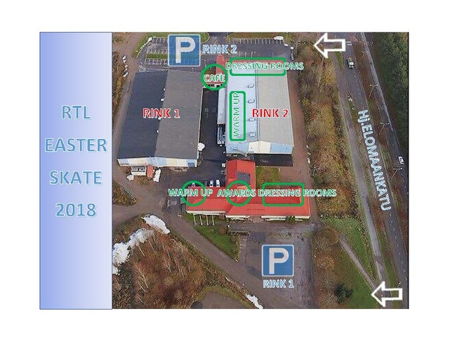 Easter Skate 2018 will be conducted in two adjacent rinks, rink 1 and rink 2, both of which have their own dressing rooms and parking areas. For easy access to your rink building, please check this page for more detailed info when the skating orders and schedules are published on March 12th. A map of car parks and buildings will be included.
