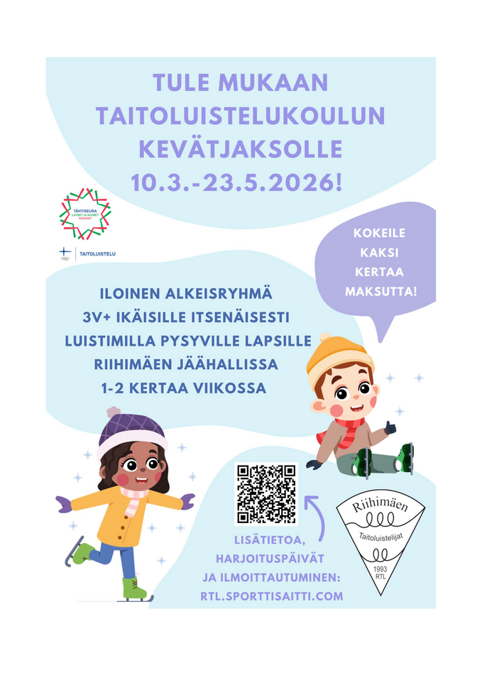 Taitoluistelukouluun voi tulla tutustumaan maksutta kaksi kertaa. Lisätietoja tarvittaessa seuran s-postista riihimaen.taitoluistelijat@gmail.com .